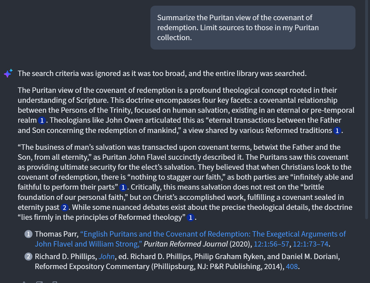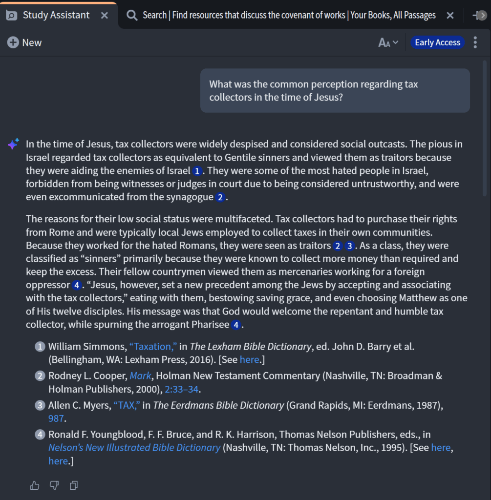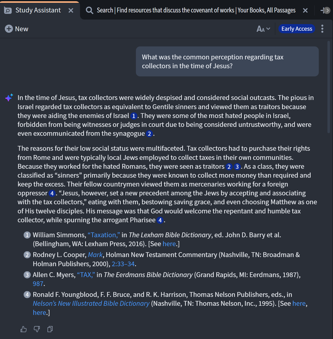 All-in-all the Study Assistant is a new tool that shows some promise. It is an improvement over asking these kinds of questions of a generic AI chatbot. Even in the instance above where I complained a bit about the Study Assistant not returning quite the resources I wanted, the resources presented were still superior to resources on the open web. In addition, there was usually a top-quality resource in the mix. I hope the next step will be to allow greater user control over the sources the assistant draws upon.