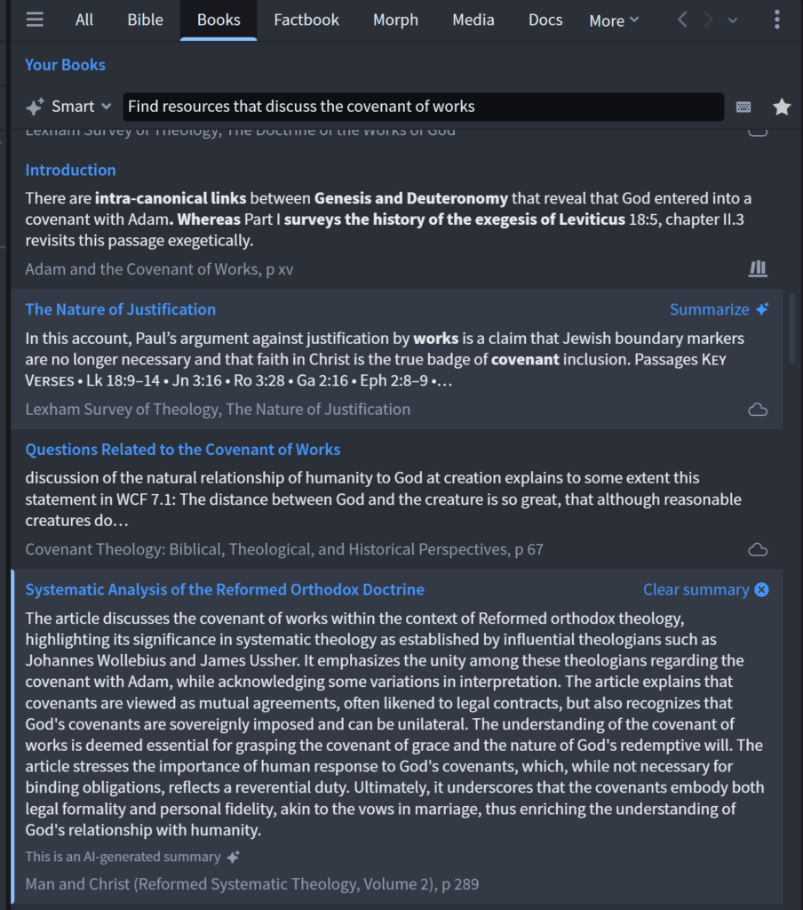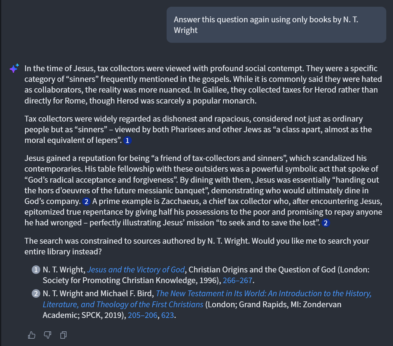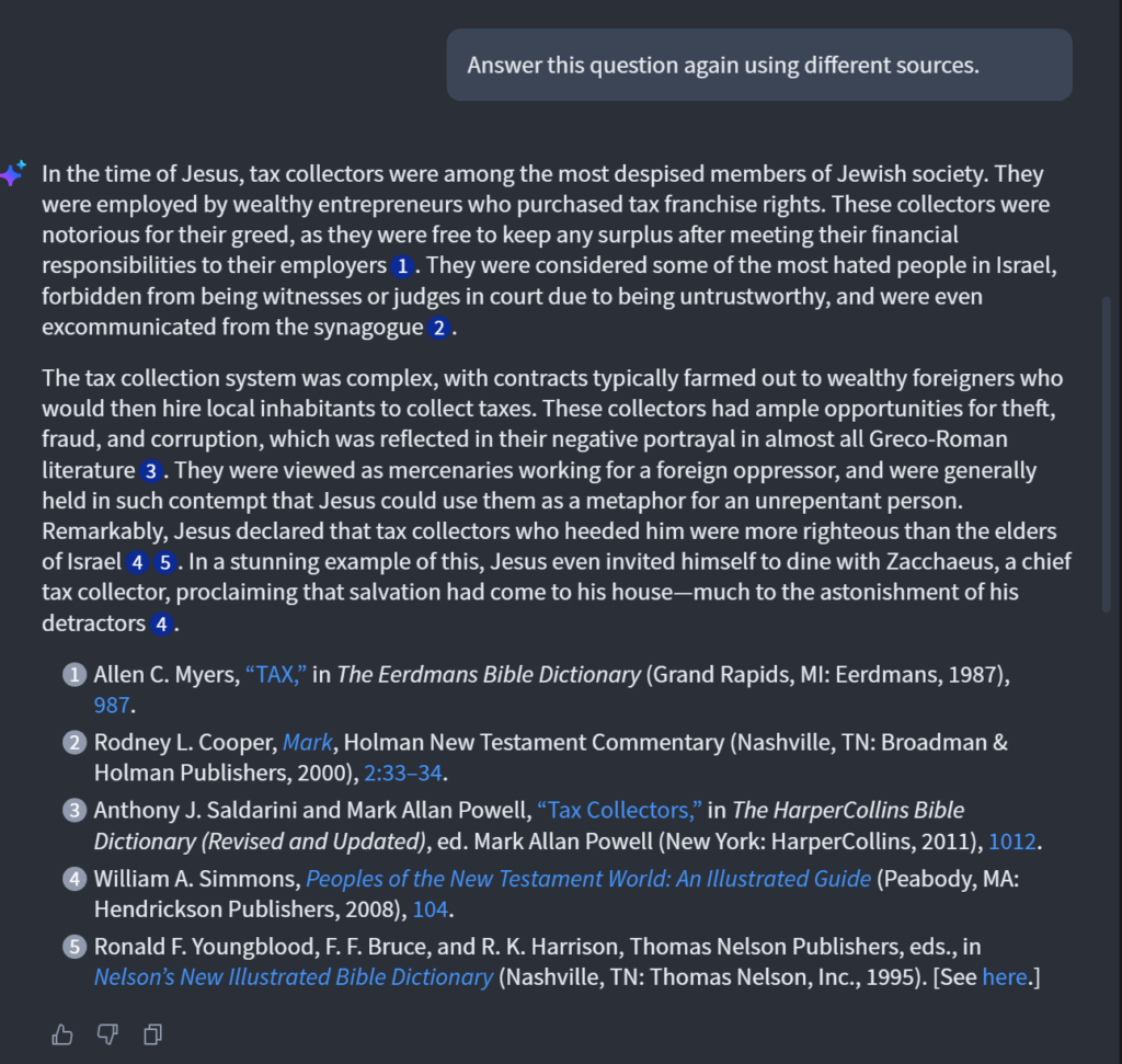 All-in-all the Study Assistant is a new tool that shows some promise. It is an improvement over asking these kinds of questions of a generic AI chatbot. Even in the instance above where I complained a bit about the Study Assistant not returning quite the resources I wanted, the resources presented were still superior to resources on the open web. In addition, there was usually a top-quality resource in the mix. I hope the next step will be to allow greater user control over the sources the assistant draws upon.