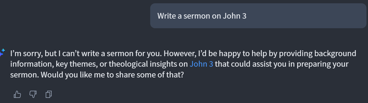 The Study Assistant also has some built in limitations that are wise. For instance, the Study Assistant won’t write a sermon or a research paper.
