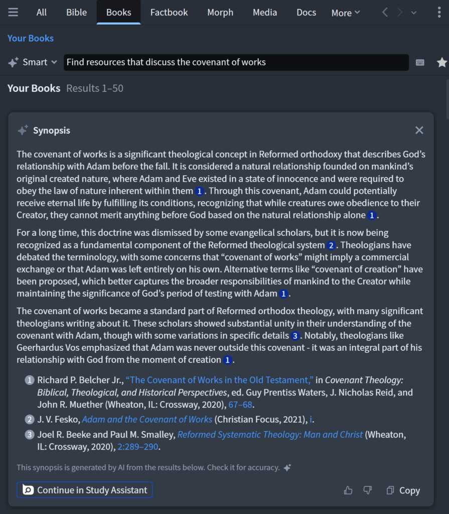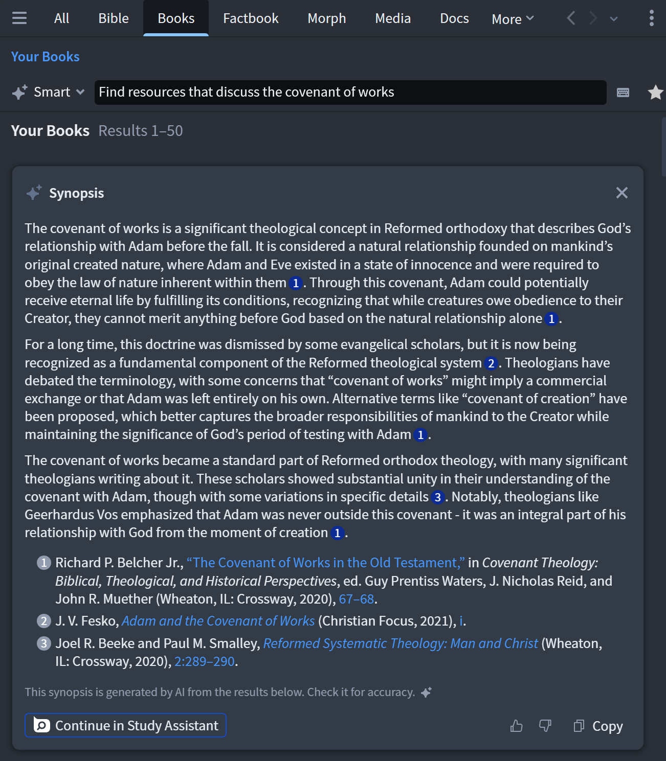 The other danger of finding answers from AI chatbots is unreliable sourcing. A chatbot that draws on the entire internet is bound to draw on poor sources. The Study Assistant in Logos, which is an expansion of the synopsis feature in search (note the Continue in Study Assistant button that now appears below the synopsis), mitigates that problem by drawing on a more select number of resources.